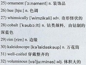 In El Mesón Galeria, gorgeous pottery pumpkins in green, gold and brown 26)hues with 27)whimsically curly vines caught my interest. They were displayed next to heavy glassware with 28)cobalt blue 29)rims, and wooden religious icons. Painted tin decorations—hearts, crosses and other symbols—made up a 30)kaleidoscope-bright display on one wall.