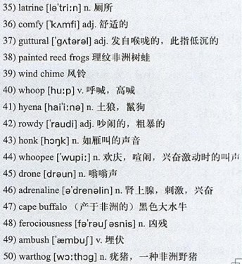 Despite the 36)comfy beds, sleep was nearly impossible, as I lay awake, reeling with excitement, listening to the fascinating foreign sounds of the night: deep 37)guttural moans from lions in the distance; choruses of 38)painted reed frogs like a symphony of bamboo 39)wind chimes; the nearby 40)whooping of 41)hyena; a hippos’ 42)rowdy 43)honks, groans and snorts were comical-sounding, like hundreds of 44)whoopee cushions. With the morning came a whole new world of music from the birds, chattering to the 45)drone of thousands of bees in the treetops.