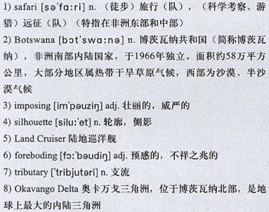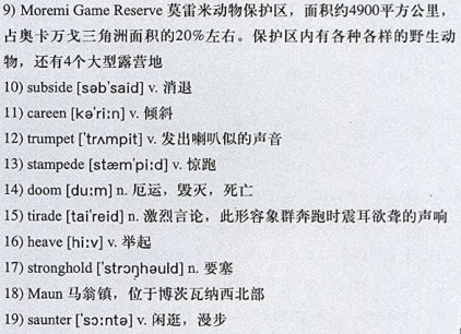 Our adventure began at a small airport in 18)Maun, gateway to the Okavango Delta, the world’s largest inland delta. As we journeyed through barren desert toward one of the delta’s wet, outstretched fingers, the landscape transformed from lifeless desolation to wildlife heaven. I watched, mesmerized, as a monstrous, confident, wild-elephant bull 19)sauntered across the dirt road mere feet away. He 20)strutted slowly, with 21)uncanny silence, his enormous gray feet kissing the earth without a whisper.