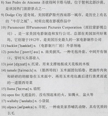 We rolled into 8)San Pedro de Atacama, kicking up a trail of dust. It’s the 9)Dodge City of one’s imagination, a 10)Paramount 11)backlot come to life, albeit with internet cafés and 12)poncho shops. Upon entering a door I was surprised to find that there was actually a restaurant beyond, and not just wooden 13)joists holding up the walls. We ordered some food. 14)Tamales and 15)llama steaks and beer that came in litre bottles. I was loving South America. In the middle of the room was an 16)open fire. Above it a large circular hole in the ceiling, through which we gazed at the stars like diamonds. I asked the waiter what happened when it rained. It doesn’t, he said.