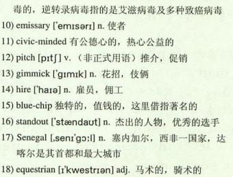 For a relatively small investment, the JPMorgan execs have assembled before them some of the most desirable potential 14)hires in the world. In addition to teams from Stanford, Harvard, Columbia and other 15)blue-chip universities, there are entrants from England and Ireland. These 16)standouts were asked to submit résumés along with their project packets, and Clippinger’s, which is typical, shows the depth of their achievements. Clippinger is a developmental studies and comparative literature double major who has spent time not only in Rwanda but also France and 17)Senegal. She captains the Brown varsity 18)equestrian team, worked as a production assistant on 19)Martin Scorsese’s The Departed, interned with the Clinton Foundation in Africa, and speaks fluent French and Wolof, which is spoken in Senegal.