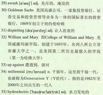 And for some, that competition is 31)dispiriting. “Your diploma means nothing; even though you went to 32)William and Mary, there’s a lot of people who went to Yale, who went to Harvard,” sighs a young woman named Nosheen. “There’s too much competition!” Her life sometimes feels like one long competition in which she is always 33)up against some better-qualified 34)millennial. But others relish the competition. “It’s fun to compete even if you don’t win. Though winning is better,” says Nimit Mehta, a Columbia student with a double major in engineering management systems and electrical engineering, who is part of the Good Venture team that aspires to bring 35)hydroelectric power to rural India.