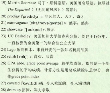 The frenzy to hire these 20)prodigies is called “the war for talent.” And, as well qualified as this group seems to be, the graduates’ appeal also lies in the fact that they’ll be paid less than more experienced workers would be. A recruiting event can no longer be just a recruiting event. Instead, it must be a competition—an 21)extravaganza where students 22)showcase their smarts and competitive instincts, and companies try to sell themselves, presenting their missions as unique, their workdays as exciting. Last spring, Google invited 23)UC Berkeley and Stanford students to the “Google Games,” a day of puzzle-solving, 24)Lego-building, sports and a trivia competition. It’s all designed, according to the Google spokesman, to “familiarize students with Google and our corporate culture of collaboration and 25)relishing challenges.”