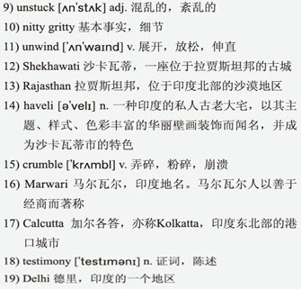12)Shekhawati in 13)Rajasthan is such a place— a unique outdoor gallery of painted14)havelis 15)crumbling into the dusty rural landscape of Rajasthan. The history of this place concerns the famous 16)Marwari traders who were located here during the days of the Spice Road, where Shekhawati was a major junction. Eventually as the railway began to stretch across India, the Marwari moved to 17)Calcutta and made their fortunes. The painted houses of this era are a 18)testimony to a rapidly changing era in Indian history and are unique in the world. There is no organised tourism as such, you just drive around and stand hopefully outside some places where you will be invited in for a look, a cup of tea, a chat. Your driver will know where to take you or drop you. As an informal kind of service, local boys will take you to houses and smooth your entry or point out otherwise undiscovered treasures.