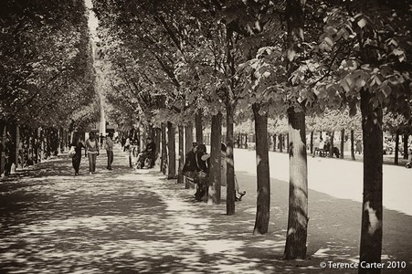 步行了十分钟以后,对于这条朱莉安和我曾经漫步过数十次的街道,我们已然有了大为不同的看法。我们走进了精致的皇家花园——我们在巴黎最喜欢的其中一个地方——坐在有大树遮荫的长椅上听着贝尔纳向我们讲解:原来红衣主教黎塞留于1629年建造枢机主教宫作为他的私人宫殿,奥尔良公爵则在1784年请人重新设计了这座建筑,把它改造成巴黎第一家综合性购物娱乐中心——里面有一个市场和140家商铺、以及众多的沙龙、博物馆、咖啡馆、戏院和赌场——并对公众开放。社会各阶层的人,从知识分子到贵族,都能在这些拱廊下轻松休闲,各式活动也在这里进行着,从卖淫嫖娼到政治阴谋,一应俱全。贝尔纳将其简述为“一座混乱城市里的一片井然有序的乐土”。即使是现在,其静谧的花园依然能把外面街道的嘈杂喧闹掩盖住。