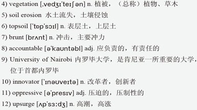 Maathai: Women have been given opportunities to study, even in countries that are 11)oppressive to them. In Kenya, for instance, Muslim communities don't tend to send their girls to school. But even in those communities, we have seen a major 12)upsurge in [women] going to school.