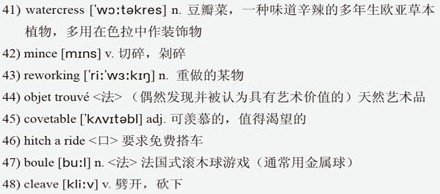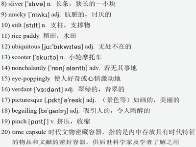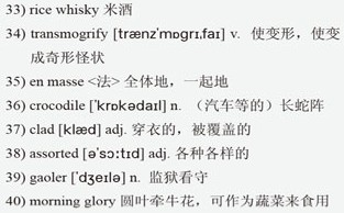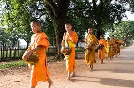 Back in Luang Prabang, at dawn the spiritually inclined—along with the more dedicated visitors—kneel along the length of the main street with offerings of rice for the 36)crocodiles of passing orange-37)clad monks. To each you must offer a handful from your tip khao—the traditional woven bamboo pot. Next on the morning to-do list for locals is the market, which snakes along a narrow street in the centre of town. There are plenty of peculiar things for sale—squirrels, 38)assorted rodents, crickets—but the main focus is fish and shellfish, particularly the small pinky-orange Mekong crabs, which are strung on large hoops of bamboo as if on some mermaid-39)gaoler’s key ring. And then there are the vegetables: neat, abundant piles of 40)morning glory and 41)watercress, and so-called river weeds (a Mekong speciality). Everywhere you look there are mini-mountains of chillies and limes, both key ingredients in the national dish of laap, a spicy 42)minced meat or fish salad.