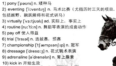 If someone wanted to try eventing, I would say that you have to want to do it and have fun. Winning is what you compete for, but if it's not making you happy or you have something you'd rather be doing, then do that. If it is really what you want, then 14)dedication and training are 15)paramount and you have to keep working hard.