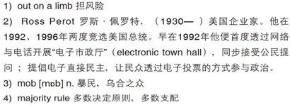 Tapscott: Well, these things have been done on a lower scale, smaller scale. IBM, for example, held a discussion of 400,000 employees over a three-day period. But I'm now in discussions with government leaders in several countries that are very serious about doing this, and this is not direct democracy, don't get me wrong, you know,2)Ross Perot and the electronic town hall, you get to vote every night on evening news. That's a.k.a. the electronic 3)mob. The democracy is a lot more than 4)majority rule on a nightly basis. But what we're talking about here is engaging citizens, especially these young kids who've grown up interacting rather than watching TV, engaging them in political life, and when you do that, good things happen from my experience. 5)Initiatives get 6)catalyzed. People start to learn more. They become more open to having real conversations. This is going to be a big change. And I'm hopeful that we're in the early days of something significant.