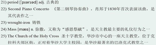 The windows look down onto Krakowskie Przedmiescie Street, Warsaw's most elegant, as well as the 23)wrought-iron gate of the city's university where Frederic studied and a church where he played organ during 24)Mass.