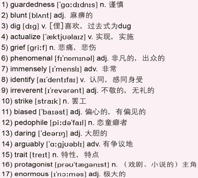 桑德拉·布洛克:好的,过去十年最打动我的表演……当然有很多,但立刻浮入我脑海的是《朗读者》中的凯特·温斯莱特。因为我了解那个年代的德国女人的境况,了解她们的处事谨慎,还有闭塞、麻痹,却热情似火。我看这部电影的时候,完全被折服了。如果我看起来像凯特·温斯莱特那样,我也会接拍裸戏,而且不断地接。可惜我不像她,所以我没有演到凯特·温斯莱特那样的角色。(笑)