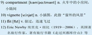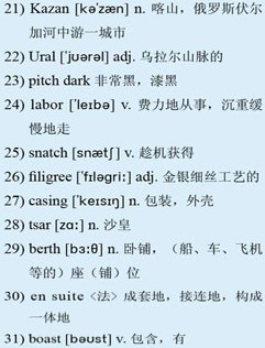 I am covering a relatively short stretch of the railway—a mere 3,188 miles—from the shores of Lake Baikal to Moscow. Since boarding on the shores of Lake Baikal six days ago, I've visited the city of 18)Irkutsk, 19)Novosibirsk, the beautiful city of 20)Ekaterinburg, and 21)Kazan. I've also crossed the 22)Urals—albeit in the 23)pitch dark and in the comfort of the dining car—and passed effortlessly from Asia to Europe, experiencing the changes in people, countryside and architecture between the two continents. I've spent enough time on the train to be familiar with her noises and movements. I feel her effort as she 24)labors uphill or shifts awkwardly round corners, and find the 25)snatched glimpses of the tracks underneath my feet as I walk between carriages and the noisy clatter of metal on metal reassuring rather than merely alarming. I can now also mispronounce sufficient Russian phrases to greet the train staff as I squeeze past them on my way to the restaurant car and to ask Sergei, my carriage attendant, for a cup of tea. This he delivers to my compartment in a podstakannik, a large, traditional tea glass with delicate 26)filigree 27)casing.