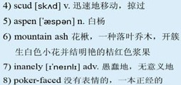 Never did I dream I would experience the first few miles of the Trans-Siberian railway standing on the locomotive. Smiling through the raindrops, I peered across 2)Lake Baikal, which alternately glittered in sunshine and darkened to 3)slate as clouds 4)scudded across the sky. The leaves of 5)aspen trees lining the lakeshore fluttered in the breeze and Siberian roses and the red berries of 6)mountain ash flashed by as we approached the 33 tunnels that break this spectacular stretch of railway, blasted from cliffs that rise sheer from the lake. Grinning 7)inanely at the 8)poker-faced driver of the Trans-Siberian, I filled my lungs with clear Siberian air.