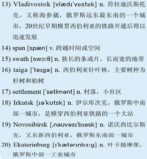 Built between 1891 and 1913, the Trans-Siberian Railway stretches for 5,753 miles from Moscow's Yaroslavsky terminal to 13)Vladivostok on the Pacific Ocean. The journey 14)spans seven time zones and as a passenger you soon grow accustomed to having two clocks on the train and station platforms—one showing Moscow time, which dictates life on board, the other displaying local time. I am traveling east to west, which means I gain more time every day to admire the scenery as we traverse 15)swathes of dense 16)taiga, vast wheat fields and pretty aspen forests, and pass tiny rural 17)settlements and cities, ancient and modern.