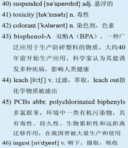 Photodegradation: As sunlight breaks down floating debris, the surface water thickens with 40)suspended plastic bits. This is bad for a couple of reasons. First, Bamford says, is plastic's “inherent 41)toxicity”: It often contains 42)colorants and chemicals like 43)bisphenol-A, which studies have linked to various environmental and health problems, and these toxins may 44)leach out into the seawater. Plastic has also been shown to absorb pre-existing organic pollutants like 45)PCBs from the surrounding seawater, which can enter the food chain—along with BPA and other inherent toxins—if the plastic bits are accidentally 46)ingested by marine life.