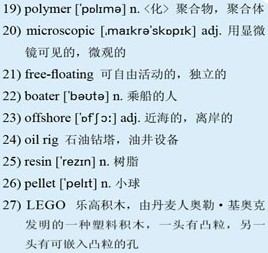 About 80 percent of debris in the Great Pacific Garbage Patch comes from land, much of which is plastic bags, bottles and various other consumer products. 21)Free-floating fishing nets make up another 10 percent of all marine litter. The rest comes largely from recreational 22)boaters, 23)offshore 24)oil rigs and large cargo ships, which drop about 10,000 steel shipping containers into the sea each year, full of things like hockey gloves, computer monitors, 25)resin 26)pellets and 27)LEGOs. But despite such diversity—and plenty of metal, glass and rubber in the garbage patch—the majority of material is still plastic, since most everything else sinks or biodegrades before it gets there.