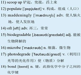 Unlike most other trash, plastic isn't 15)biodegradable—i.e., the 16)microbes that break down other substances don't recognize plastic as food, leaving it to float there forever. Sunlight does eventually “17)photodegrade” the 18)bonds in plastic 19)polymers, reducing it to smaller and smaller pieces, but that just makes matters worse. The plastic still never goes away; it just becomes 20)microscopic and may be eaten by tiny marine organisms, entering the food chain.