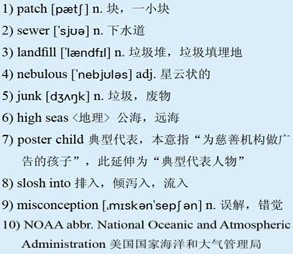 Instead, it's like a galaxy of garbage, 12)populated by billions of smaller trash islands that may be hidden underwater or spread out over many miles. That can make it 13)maddeningly difficult to study—Bamford says we still don't know how big the garbage patch is, despite the 14)oft-cited claim that it's as big as Texas.