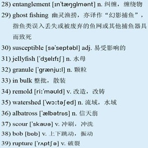 28)Entanglement: The growing number of abandoned plastic fishing nets is one of the greatest dangers from marine debris, Bamford says. The nets entangle seals, sea turtles and other animals in a phenomenon known as “29)ghost fishing,” often drowning them. With more fishermen from developing countries now using plastic for its low cost and high durability, many abandoned nets can continue fishing on their own for months or years.