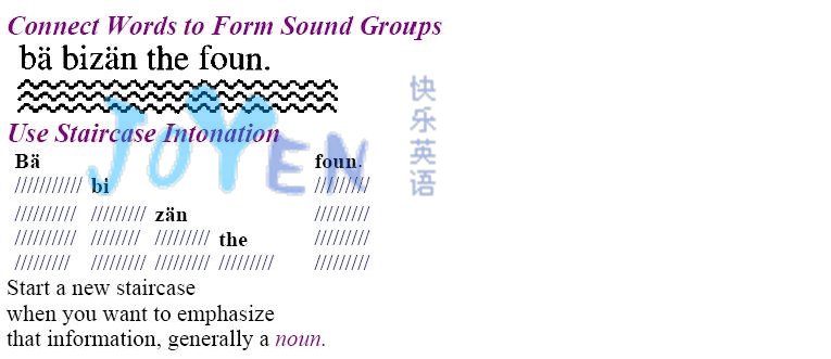 In saying your words, imagine that they come out as if they were bounding lightly down a flight of stairs. Every so often, one jumps up to another level, and then starts down again. Americans tend to stretch out their sounds longer than you may think is natural. So to lengthen your vowel sounds, put them on two stairsteps instead of just one.