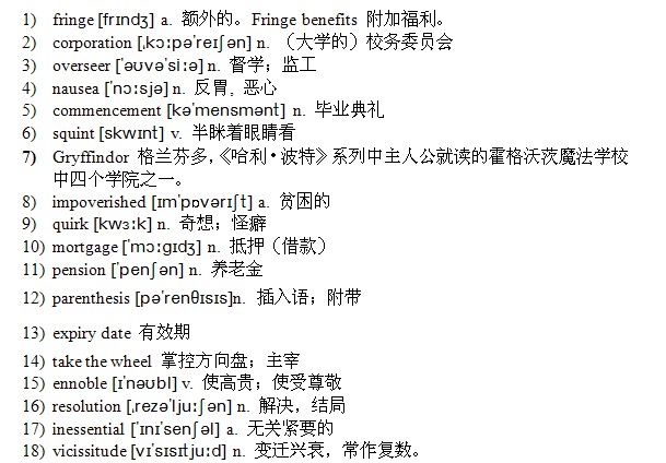 The first thing I would like to say is “thank you.” Not only has Harvard given me an extraordinary honour, but the weeks of fear and 4)nausea I have endured at the thought of giving this 5)commencement address have made me lose weight. A win-win situation! Now all I have to do is take deep breaths, 6)squint at the red banners and convince myself that I am at the world’s largest 7)Gryffindor reunion.
