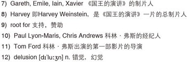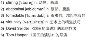 奥斯卡获奖感言通常都是以感谢为主题,科林·弗斯也不例外,但他在这个框架内玩起了英式幽默,充分发挥了风趣的个人特点,避免了千篇一律的发言。同时,在这种即兴性非常强的激动时刻,他还做到了让自己的笑话首尾呼应。事后,科林·弗斯的获奖感言被广泛认为是那个晚上最出色的发言之一。听、读时注意他如何在对每个/组人表示谢意时做到内容各异,非常有针对性。