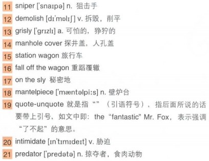 Mr. Fox: (To Mrs. Fox)Badger’s right. These farmers aren’t going to quit until they catch me. I shouldn’t have lied to your face, I shouldn’t have 16)fallen off the wagon and started secretly stealing chickens 17)on the sly. I shouldn’t have pushed these farmers so far and tried to embarrass them and cuss with their heads. I enjoyed it, but I shouldn’t have done it. And now there’s only one way out. Maybe if I hand myself over, and let them kill me, stuff me and hang me over their 18)mantelpiece...