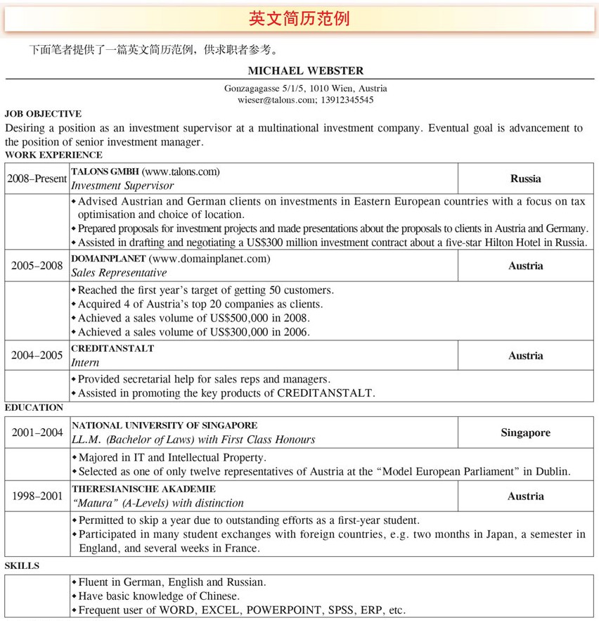 简历,顾名思义,就是对求职者学历、经历、特长、爱好及其他有关情况所做的简要书面介绍。简历是求职者个人资历、能力以及个人形象的书面表述,是用人单位了解求职者的第一扇窗。但是,外企HR在筛选堆积如山的简历时,由于时间和精力所限,不可能细读所有简历,据说他们通常平均每15秒钟看一份简历。因此,对于求职者来说,要想在这短短的15秒钟抓住HR的眼球,给其留下深刻印象,进而获得面试机会,就需要打造一份成功的简历。本期笔者将详细介绍英文简历的结构框架、写作技巧和注意事项,并提供一篇范例供求职者参考。