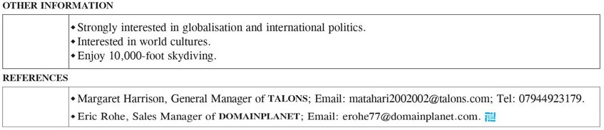 在这一部分,求职者应主要陈述对应聘职位具有辅助作用的一些信息,包括求职者的性格特征、兴趣爱好、所参加的业余活动以及在校或在以往工作中的获奖情况等。因为这部分内容涉及的信息较多,所以求职者应根据应聘职位的特征来提供相关信息,切勿随意堆砌。例如,如果求职者应聘的职位需要经常出差,求职者就可以强调自己喜欢旅行这一爱好。此外,这部分还有以下几点值得注意。