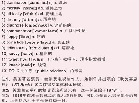 He's sort of this generation's Pat Boone注4 in a way because he's sort of putting a white face on black music. But whereas Pat Boone was making the blackness invisible while letting you get a 18)semblance of black music, Justin Bieber seems to get his credibility from being surrounded by the black artists that he emulates.