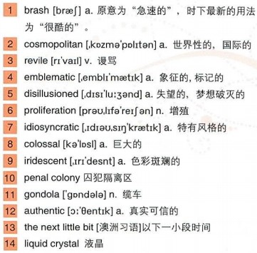Sydney is Australia’s largest, oldest and 1)brashest city, famous for a 2)cosmopolitan yet laid-back lifestyle, first-rate beaches, world-class surfing and a glorious harbor that showcases one of the world’s most distinctive buildings, the Sydney Opera House. At first 3)reviled for its startling modern design, the opera house has come to be as 4)emblematic of Sydney as the Eiffel Tower is of Paris. The building took 15 years to complete, during which time its 5)disillusioned Danish architect, Jorn Utzon, resigned and later refused to see his finished masterpiece. Utzon’s groundbreaking design pushed the limits of engineering making greater use of computer analysis and giving way to a global 6)proliferation of shapely, 7)idiosyncratic buildings. From the day it opened in 1973, the opera house, with its 8)colossal 9)iridescent shells, continues to attract a steady stream of wide-eyed visitors and is home to some of the world’s most innovative theatrical productions.