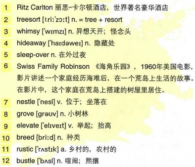 With over a dozen 9)elevated cabins across 36 acres of forest, Treesort has a tree house for every 10)breed of family, whether you’re a pair of lovebirds or a tribe of eight. But this is hardly 11)rustic living. Most cabins come with beds, sinks and refrigerators and average around a hundred dollars a night.