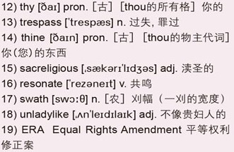 Jacqui: Do you know, I was brought up a Catholic and I changed the Lord's Prayer and I said, “Our mother, who art in heaven, Sister we call 12)Thy name. Our kitchen's done, our nursery's run on Earth and it isn't Heaven. Give us the right to earn our bread and forgive us our 13)trespasses as we forgive men who trespass against us. Lead us not into temptation, but deliver us from Adam. For 14)Thine is the freedom and the power and the glory for ever. A-women.” And a couple of Irishmen said, “That's 15)sacreligious!” But it made its point.