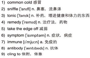 For anyone with a 2)sniffle, a 3)tonic, not just another cold 4)remedy that 5)takes the edge off the6)symptoms, but a cure that stops the virus in its tracks. Cambridge scientists have discovered a new 7)immune defense mechanism that could lead to the first effective treatment for the common cold. With each of us suffering three colds a year, children even more, it's little wonder that the medicine would prove popular.