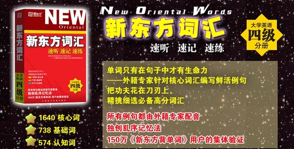 全面收录大学英语四级考试大纲中的词汇,由新东方资深教师根据考点精挑细选,包括1640核心词汇, 738基础词汇,574认知词汇;不同等级,分别记忆,对四级考试更有针对性。